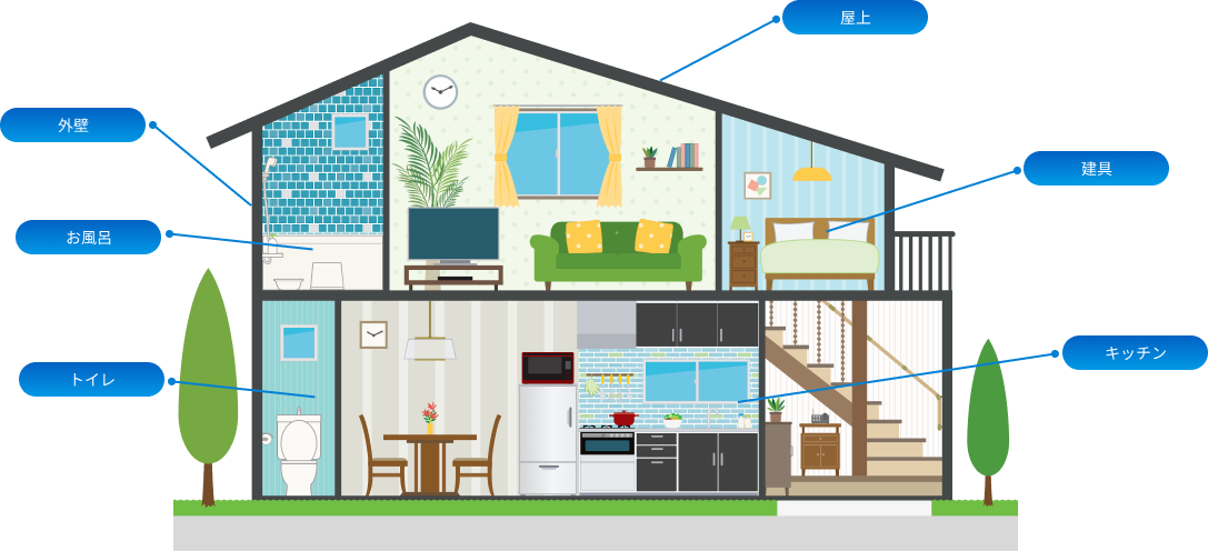 壁紙や床材の交換、間取り変更などで、居心地の良い空間を作り出します。デザイン性と機能性を兼ね備えた内装で、家の雰囲気を一新します。